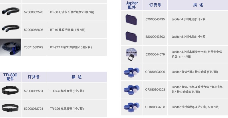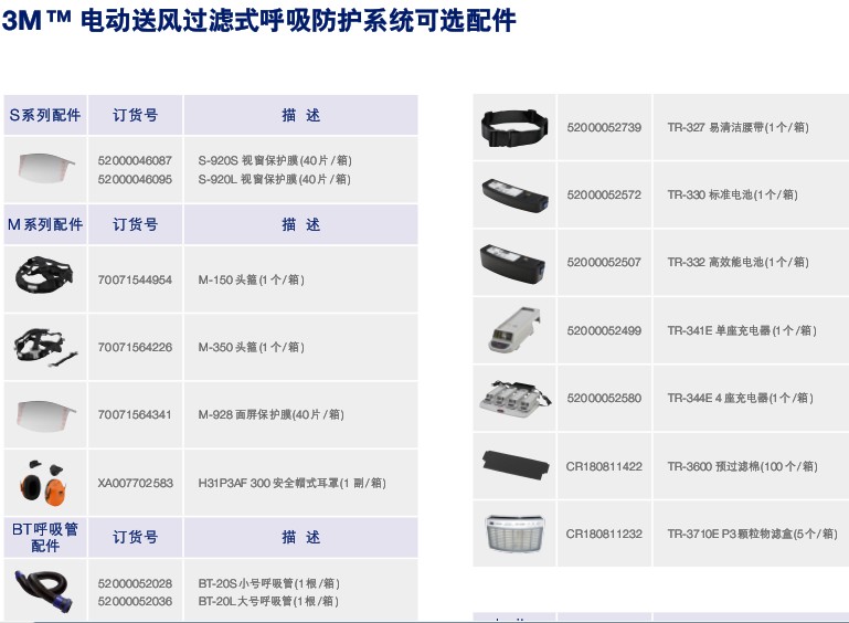 套裝包含:TR-315E 送風(fēng)電機套件( 包括TR-302E 送風(fēng)電機、顆粒物過濾盒、預(yù)過濾棉、標準腰帶、高效能電池、單座充電器、BT-30 可調(diào)節(jié)長度呼吸管各一個)