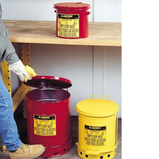 符合美國OSHA 要求的油漬廢品罐是在使用浸有溶劑的布和抹布時的必備品。浸有溶劑、稀釋劑、亞麻籽油、可燃粘合劑和其他易燃液體的抹布和布如果隨意拋棄,將有極大的火災隱患。經過專門設計的蓋子打開的角度不超過60度,不使用時將保持關閉,將內容物與火源隔離,限制氧氣量,因此可有效地消除自燃隱患。圓形的構造和加高的罐底可促進罐體周圍的空氣流通,從而達到散熱以及減少因水分聚集而生銹的目的。耐用的鋼制構造采用耐化學腐蝕的粉末涂料涂飾。