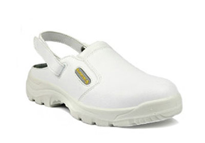 白色安全涼鞋,無紡布襯里,吸水快干,細纖維鞋面,聚酰胺&EVA鞋墊,雙密度PU注塑鞋底,金屬防砸包頭,耐油、耐腐蝕。