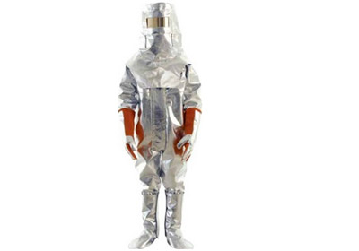 隔熱連體套裝,表面鍍鋁隔熱面料(不含石棉),頭罩帶有可更換鍍金大視野面屏,手套掌面為牛皮材質。靴套采用魔術貼粘貼