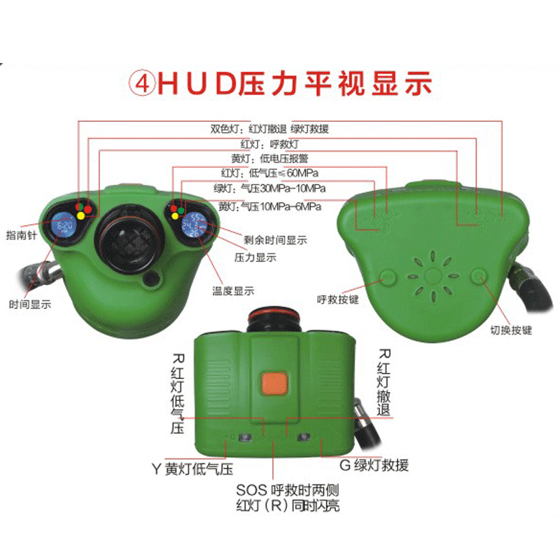 產品特點:該產品的壓力平視顯示裝置采用有線連接,避免了需要對碼的繁瑣操作,也避免了HUD接收端還需要開關的麻煩;并且,改產品采用了新穎的液晶平視顯示模式!使用者直接就可以看到氣壓數據、剩余時間、環境溫度、數字時鐘、指南針等信息,不需要動手那胸前的壓力表或者數字表,解放了雙手。這在實踐中也是非常重要的;該產品還擁有位移呼救功能,也即智能保鏢功能,預報功能,正式功能、主動報警功能和消防呼救器完全一致;當然。本產品也同時具備正常空氣呼吸器所具有的所有結構與功能。
