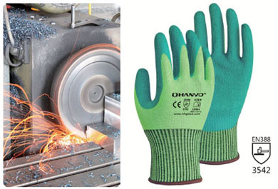 產品名稱:興譽LN384 防切割防穿刺手套 產品簡介: 13 針 HPPE加玻纖熒光綠浸高耐磨乳膠出紋掌浸 防切割紗線提供防割保護. 高耐磨乳膠出紋浸膠方式提供優良的抓握能力以及提高防割級別. 對切割,耐磨,和穿刺均有一定的防護作用. 符合人體力學的設計,降低了手指疲勞感從而增加舒適度. 應用領域: 機械操作 金屬 & 玻璃搬運 建筑工地 汽車工廠 垃圾處理 倉庫搬運