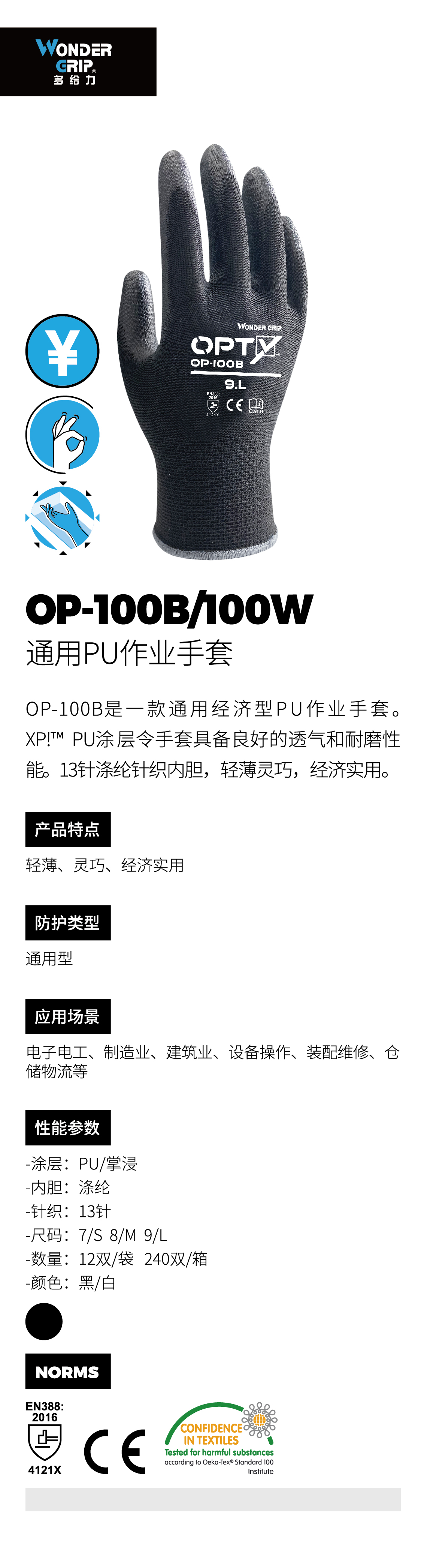 產品名稱:多給力 OP-100W PU涂掌手套 產品描述: 滌綸內膽,提高手套透氣性,更加貼合手掌; PU涂層令手套具備良好的耐磨性能; 推薦行業: 電子電工 制造業 建筑業 設備操作 裝配維修 倉儲物流等;