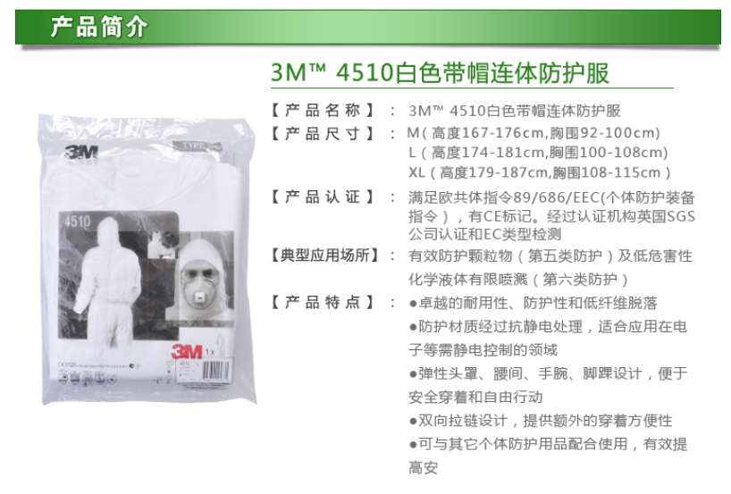 產品名稱:3M 4510白色帶帽連體防護服M